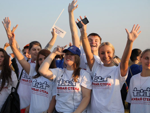 К вечеру акция продолжилась на Мылкинской дамбе. Взявшись за руки, комсомольчане выстроились в линию вдоль защитного сооружения – точно так же, как год назад военные и спасатели для защиты города сдерживали собой подступающую воду. Длина «Живой стены» составила более 1,5 километров. По сигналу участники флеш-моба запустили в небо воздушные шары.